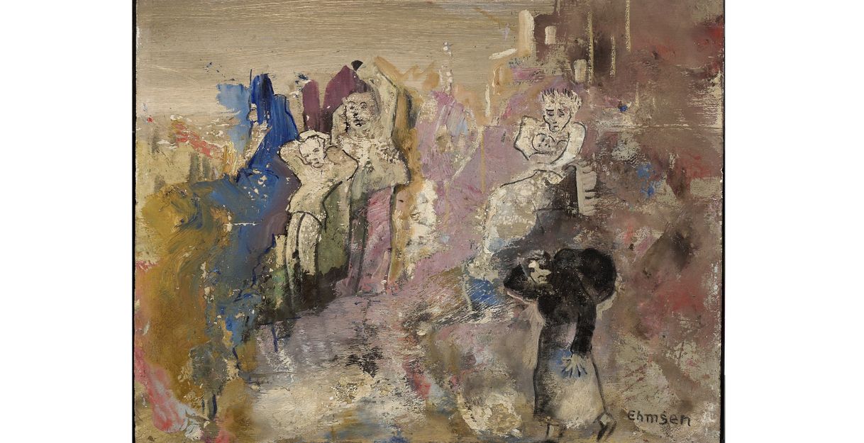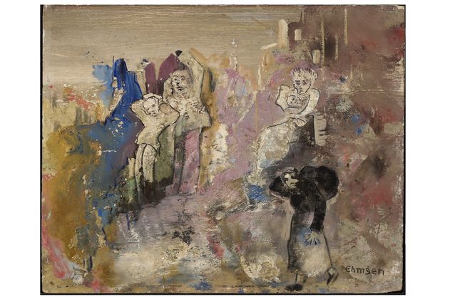 1937 wurden Ehmsens Werke in der nationalsozialistischen Ausstellung „Entartete Kunst“ diffamiert. Kurz vor Kriegsende wurde sein Berliner Atelier durch Bomben zerstört. Nach dem Ende des Krieges verarbeitet Ehmsen das Erlebte in seiner Malerei. In den drei ausgestellten Ölgemälden der Nachkriegszeit wird die Zerstörungen und das Leid des Krieges thematisiert. Die dargestellten Figuren, deren hoffnungslose Gesichter vom Erfahrenen gezeichnet sind, spiegeln Verlust, Verzweiflung und Trauer wider.