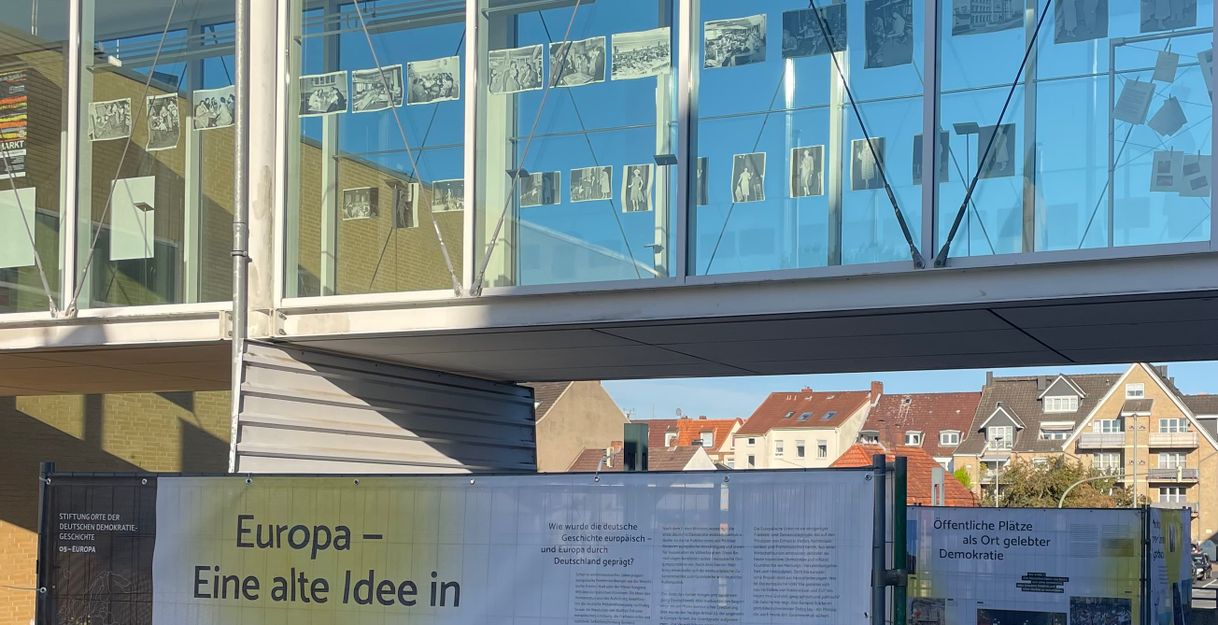vor der Stadthalle eine temporäre Ausstellung der Stiftung Orte der deutschen