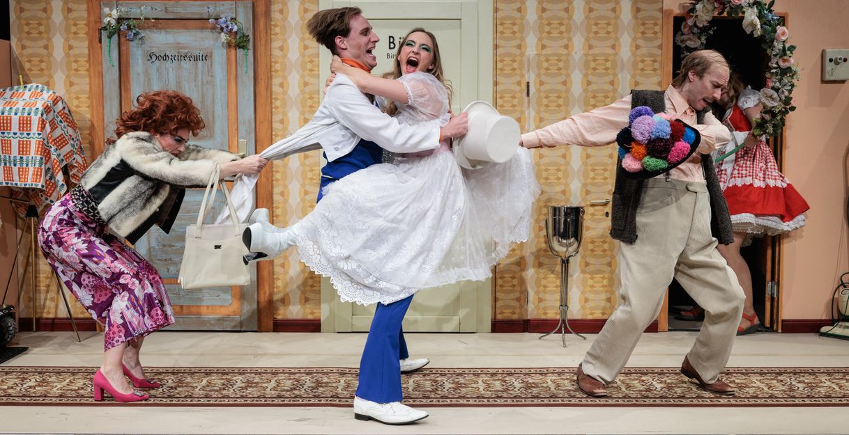 doppeltes Gehalt, doppeltes Essen! Doch sein Plan läuft aus dem Ruder, als sich der Mafioso als Frau entpuppt, die wiederum dem feschen Schweden verfällt. Während sich Kemal in einem Gewirr aus Missverständnissen, falschen Identitäten und amourösen Verwicklungen verliert, explodiert das Chaos im Hotel-Restaurant Zum Goldenen Carlo. Plötzlich taucht auch noch der totgeglaubte Federico Rasponi auf, sprengt eine Hochzeit und beansprucht nicht nur seine Ex-Verlobte, sondern vor allem deren Mitgift. In der Bearbeitung von John von Düffel wird Venedig wird zu Pforzheim und Goldonis Klassiker landet in den 1970er Jahren.