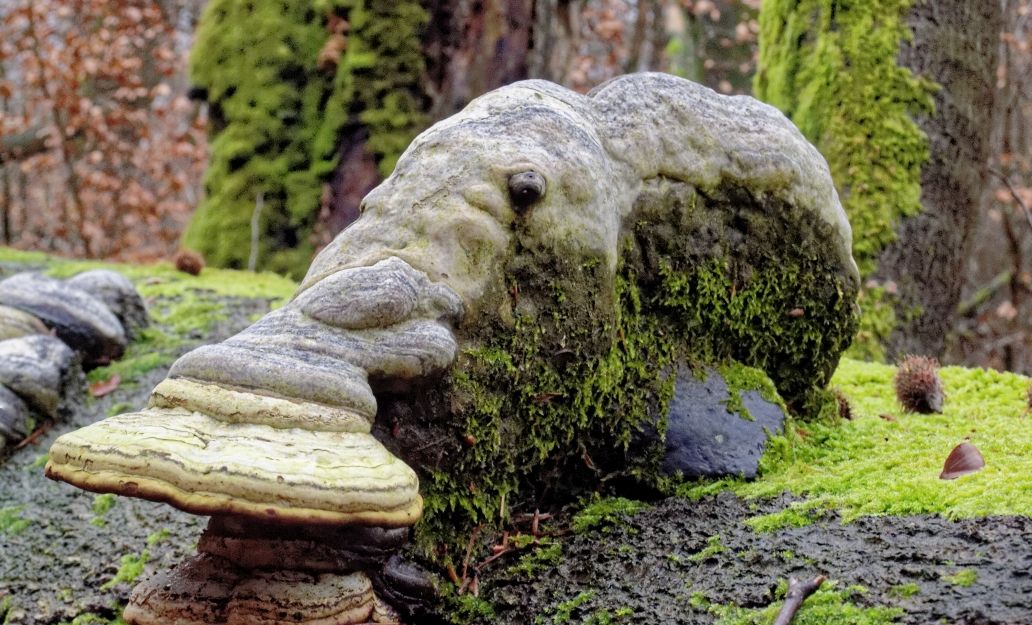 Korallenartig anmutend, dem Gefieder einer Eule ähnelnd oder wie die Skulptur eines Elefanten scheinend; Texturen, die von scheinbar fellig bis feucht-glibschig reichen - und Farben, so neonorange, so sonnenblumengelb, dass sie im ansonsten grün-braunen Wald völlig aus dem Bild fallen ...