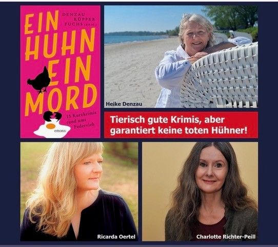 Die Autorinnen Heike Denzau, Ricarda Oertel und Charlotte Richter-Peill lesen aus der Sammlung „Ein Huhn, ein Mord“ * tierisch spannende Kurzkrimis rund ums Huhn. Ob schräge Vögel, krähende Hähne oder gackernde Hühner – in den hier versammelten Kurzgeschichten dreht sich alles um das liebe Federvieh. Tödliche Machenschaften im Hühnerstall, ein ungeahnt gefährlicher Krähwettbewerb, eine Influencerin mit gefiederter Konkurrenz oder zwei Hamburger Marktleute, die ein Hühnchen (miteinander) zu rupfen haben – tierisch gute Krimis, bei denen es zwar die eine oder andere Leiche gibt, aber garantiert keine toten Hühner!