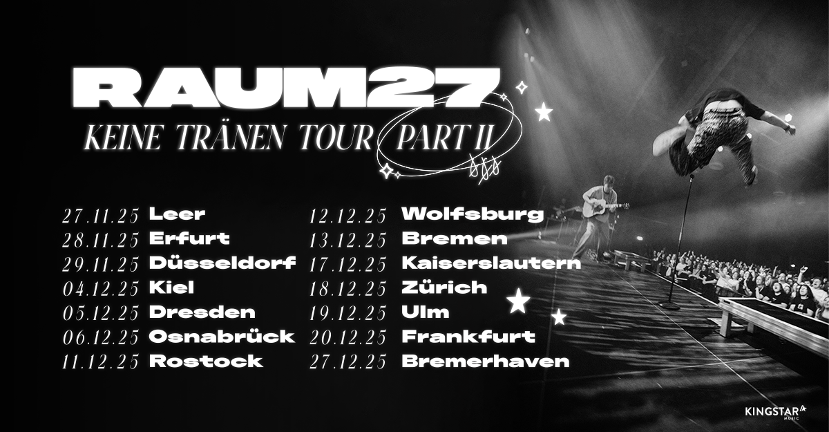 Nach dem sensationellen Erfolg ihres zweiten Albums *Keine Tränen* und einer nahezu restlos ausverkauften Frühjahrstour kehren RAUM27 im Winter 2025 für eine Fortsetzung zurück auf die Bühne. Die „Keine Tränen Tour Part II“ führt RAUM27 ab dem 27. November erneut durch 14 Städte in Deutschland und der Schweiz – darunter Erfurt, Düsseldorf, Dresden, Bremen, Frankfurt, Zürich und viele weitere.