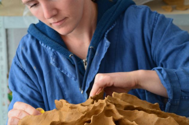 Marilen Rauch formt im Keramikkünstlerhaus eine neue, poetische und künstliche Landschaft aus den Überresten des Feldspatmehls aus der Grube von Forshammar. Was der Erde entnommen wurde, wird hier wieder sichtbar. Zwischen den Sedimenten tauchen keramische Objekte auf, die zwischen Artefakt und organischer Form schweben und an archäologische Fundstücke einer industriellen Vergangenheit erinnern. Die Besucher:innen sind eingeladen, die Landschaft zu erkunden.
