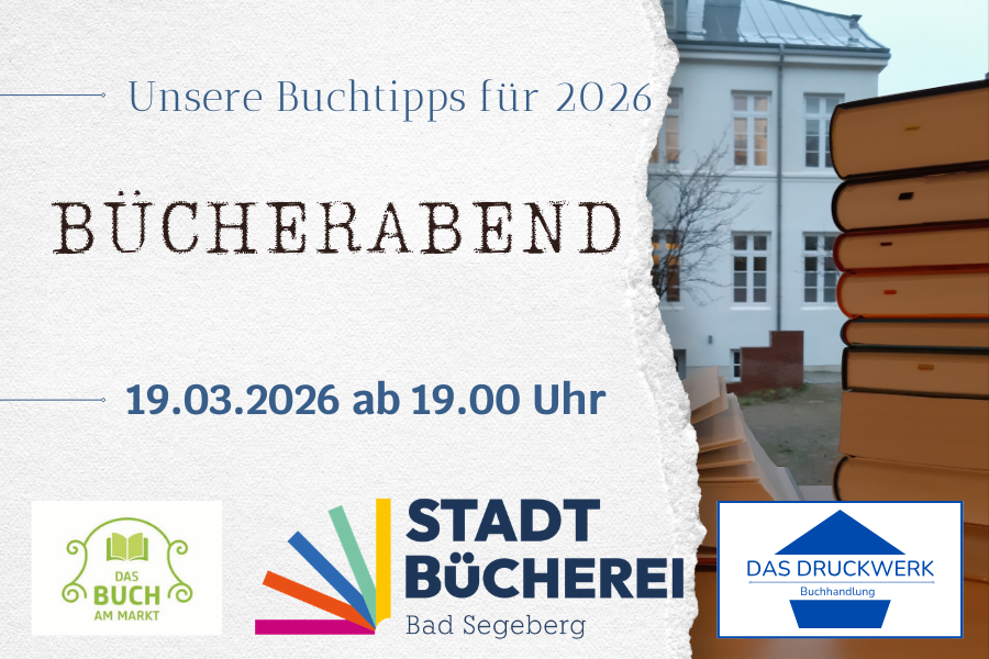 Das neue Bücherjahr ist bereits in vollem Gange. Die Leipziger Buchmesse öffnet ihre Pforten im März. Und Sie wissen immer noch nicht, welche Bücher Sie in 2026 begleiten sollen? Keine Sorge! Die gesammelte Segeberger Literaturkompetenz wird Ihnen an diesem Abend mit Rat und Tat Lektüren empfehlen, dass Ihnen nur so die Ohren klingeln!