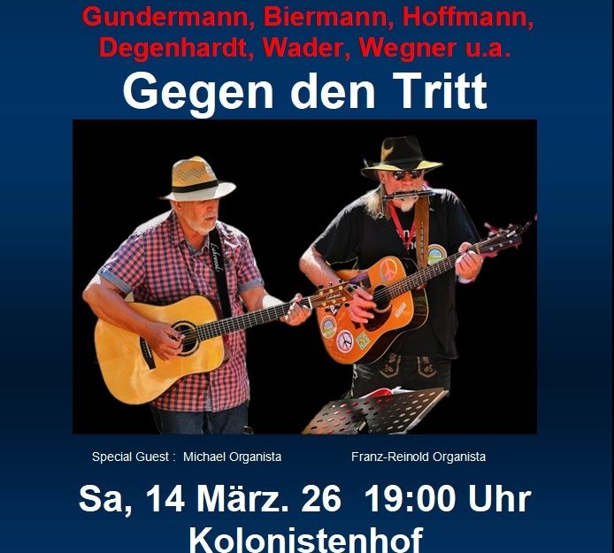 Gegen den Tritt spielt am Samstag, den 14. März 2026 auf dem Kolonistenhof in Neu Duvenstedt-Nord einen Liedermacherabend. Franz Organista hat seinen Bruder Michael, mit dem er schon früher bei der Band Hüttenfolk zusammengearbeitet hat, als special Guest zu diesem Konzert eingeladen. Auf dem Programm stehen Songs und Lieder von Gundermann, Biermann, Hoffmann, Degenhardt, Danzer, Debus, Domdey, Wader, Wegner, u. v. a. Das Konzert beginnt um 19:00 Uhr. Anmeldungen und Reservierugen sind jetzt möglich unter Tel. 04338 65 49 582 oder info@huettenfolk.eu.