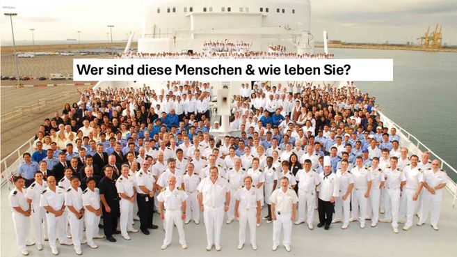 Große Schiffe wie z.B. die "AIDAnova" beherbergen 6.600 Passagiere, die von etwa 1.600 Besatzungsmitgliedern rund um die Uhr betreut werden.