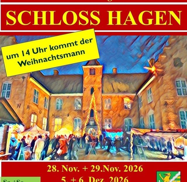 Vor dem Schloss Hagen und im Gewölbekeller findet der bunte Weihnachtsmarkt statt. Mit Tannenbaumverkauf, Weihnachtsmann (um 14 Uhr) und allerlei Weihnachtlichem.