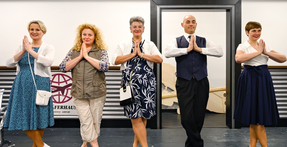 Weil sich das Boarding verzögert, müssen vier Frauen unfreiwillig am Flughafen warten. Ansonsten haben sie nicht viel gemeinsam: die vornehme Viola (Heike Ingwersen), die Karrierefrau Gabriele (Mareike Münz), die etwas naive Hausfrau Doris (Annett Schnoor) und die sich nach einem Kind sehnende Anja (Sabine Laube). Was unsere Damen jedoch eint: Sie alle sind in oder kurz vor den Wechseljahren. Und Themen der Wechseljahre werden ihre Gespräche beherrschen. Dabei geht es in urkomischen Dialogen mit viel Tempo rund, und auch der Flugbegleiter René (Sezer Uzunoglu) hat das eine oder andere Dilemma mit den Damen auszustehen. Wie in einer Frauenzeitschrift wird ein Thema nach dem anderen abgehakt: Schlaflosigkeit, Hitzewallungen, Panikattacken, Anti-Aging, Beauty-Werbung und noch vieles mehr. Und zu jedem Thema ein passender Song, denn schließlich handelt es sich um eine musikalische Revue, die es in sich hat und unter der Regie von Philip Lüsebrink absolut gute Unterhaltung verspricht!